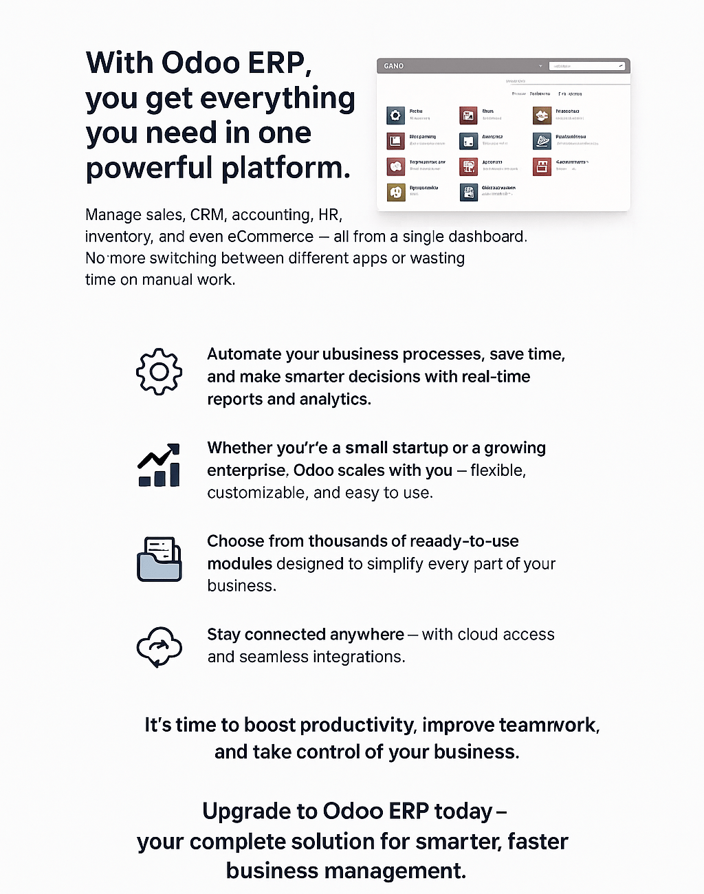 Manage inventory, HR, and eCommerce efficiently through one powerful business management platform.